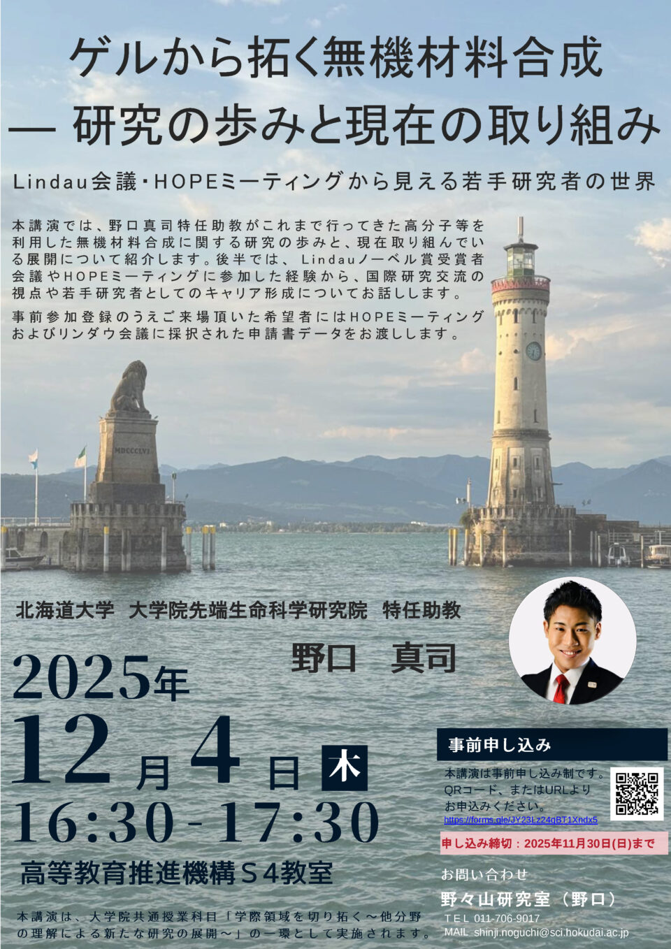 In the latter half, he will share insights from his participation in the Lindau Nobel Laureate Meetings and the HOPE Meetings, discussing international research exchange and career development for early-career researchers.