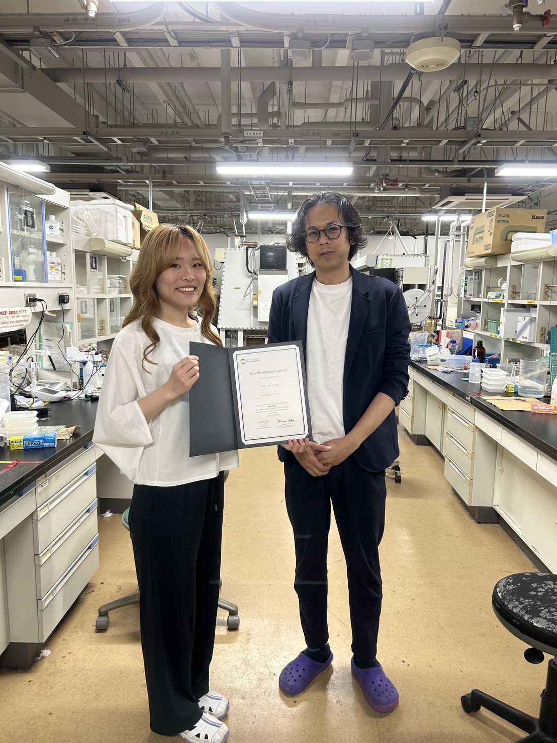 Ms. Kagari Maruyama won RSC Soft Matter Award at 36th Annual Meeting of Research Group on Polymer Gels for her oral presentation “Creation of polymeric materials possessing photonic structure by simple polymerization”. The award certificate arrived four months late, and she took a commemorative photo with her supervisor, Associate Professor Takayuki Nonoyama to express her joy. Congratulations!