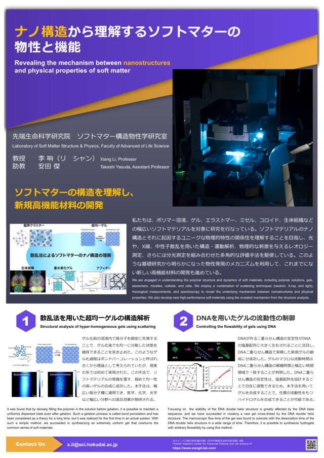私たちは、ポリマー溶液、ゲル、エラストマー、ミセル、コロイド、生体組織などの幅広いソフトマテリアルを対象に研究を行なっている。ソフトマテリアルのナノ構造とそれに起因するユニークな物理的特性の関係性を理解することを目指し、光や、X線、中性子散乱を用いた構造・ダイナミックス解析、物理的な刺激を与えるレオロジー測定、さらには分光測定を組み合わせた多角的な評価手法を駆使している。このような基礎研究から明らかになった物性発現のメカニズムを利用して、これまでにない新しい高機能材料の開発も進めている。