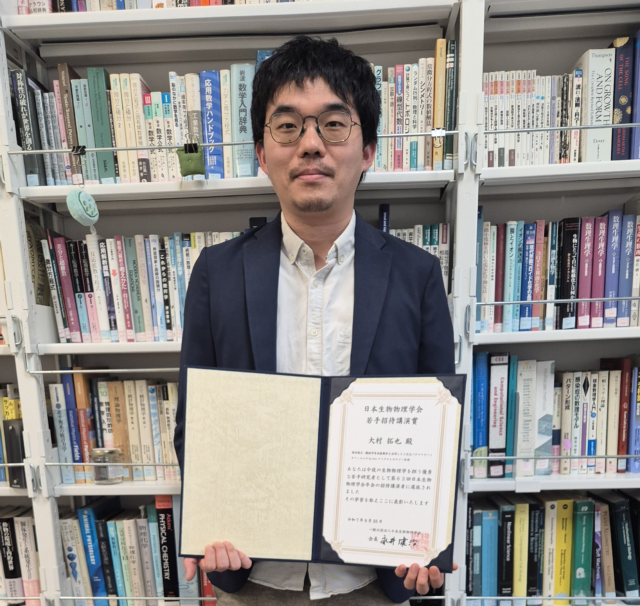 2025/10/08 大村拓也助教が日本生物物理学会の若手招待講演賞を受賞 受賞 物理エソロジー研究室の大村拓也助教が日本生物物理学会の若手招待講演賞を受賞しました。 本賞は、今後の生物物理学を担う優秀な若手研究者として日本生物物理学会年会の招待講演者に選抜された者に贈られる賞です。 大村助教は第63回日本生物物理学会年会にて招待講演を行いました。 受賞日:2025年9月25日 受賞者名: 大村 拓也 職名:助教 所属:生命科学院 ソフトマター専攻(物理エソロジー研究室) /電子科学研究所 賞名:日本生物物理学会若手招待講演賞 授与団体:日本生物物理学会 研究題目:機械学習画像解析を活用した3次元バクテリアバイオフィルムのIn vivoマイクロレオロジー計測