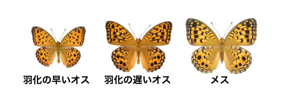 チョウのオスはメスより早めに羽化するのが一般的です。交尾回数を増やす作戦のようです。ところが、オオウラギンヒョウモンというチョウは少し変わっていて、メスと同じ頃に遅めに羽化するオスも存在します。なぜでしょうか?