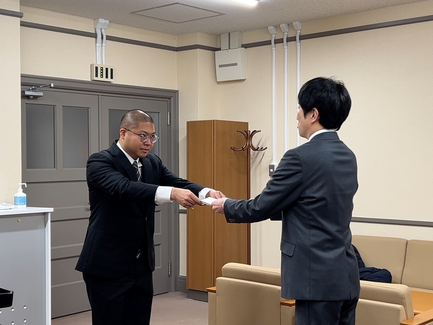 2025/12/02 先端生命科学研究院 辞令交付 ニュース 令和7年12月1日付で、先端生命科学研究院の辞令交付が行われました。 〈採用〉 中川 慎太郎(なかがわ しんたろう)氏が次世代ソフトマテリアル共創拠点・特任准教授として採用されました。おめでとうございます! 辞令交付の様子 中川 慎太郎 特任准教授(左)と芳賀 永 研究院長